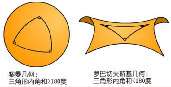 从不同于第五公设的其他假设出发,我们可以得到和欧几里得原来的版本稍有不同的一些定理。比如“三角形内角和等于180度”是从第五公设推出来的,假如过一点可以作一条以上的平行线,那么三角形的内角和便小于180度了。反之,要是过一点无法作已知直线的平行线,结果就是三角形的内角和大于180度。对于后者来说容易想象的就是球面,任何看上去平行的直线最终必定交汇。比方说在地球的赤道上所有的经线似乎都互相平行,但它们最终都在两极点相交。如果你在地球表面画一个三角形,它的内角和会超出180度,当然,你得画得足够大才测量得到。传说高斯曾经把三座山峰当作三角形的三个顶点来测量它们的内角和,但似乎没有发现什么。不过他要是在星系间做这样的测量,其结果就会很明显了:星系的质量造成了空间的可观弯曲。