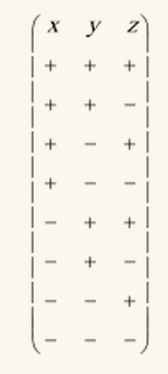 实际上我们生活在一个3维空间,可以在3个方向上进行观测,我们把这3个方向假设为x,y,z。它们并不一定需要互相垂直,任意地取便是。每个粒子的自旋在一个特定的方向无非是正负两种可能,那么在3个方向上无非总共是8种可能(把每个方向想像成一根爻,那么组合结果无非是8个卦)。