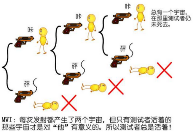各位也许对这里的人择原理大感困惑。无论如何,枪一直“咔”是一个极小极小的概率不是吗(如果n次,则概率就是1/2n)?怎么能说对你而言枪“必定”会这样行动呢?但问题在于,“对你而言”的前提是,“你”必须存在!