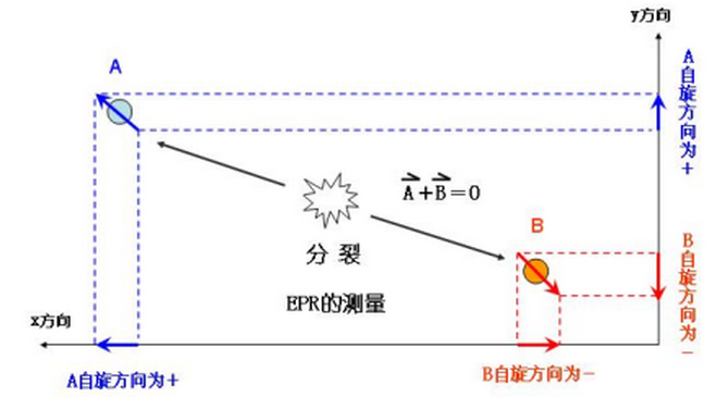 要是你已经忘记了EPR是个什么东西,可以先复习一下我们史话的8-4。我们所描述的实际上是经过玻姆简化过的EPR版本,不过它们在本质上是一样的。现在让我们重做EPR实验:一个母粒子分裂成向相反方向飞开去的两个小粒子A和B,它们理论上具有相反的自旋方向,但在没有观察之前,照量子派的讲法,它们的自旋是处在不确定的叠加态中的,而爱因斯坦则坚持,从分离的那一刻起,A和B的状态就都是确定了的。