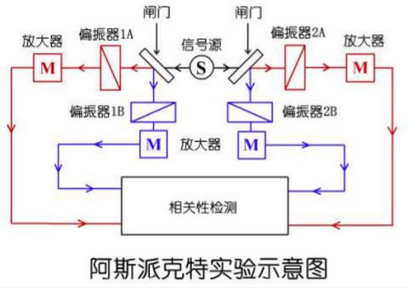 法国人用钙原子作为光子对的来源,他们把钙原子激发到一个很高的量子态,当它落回到未激发态时,就释放出能量,也就是一对对光子。实际使用的是一束钙原子,但是可以用激光来聚焦,使它们精确地激发,这样就产生了一个强信号源。阿斯派克特等人使两个光子飞出相隔约12米远,这样即使信号以光速在它们之间传播,也要花上40纳秒(ns)的时间。光子经过一道闸门进入一对偏振器,但这个闸门也可以改变方向,引导它们去向两个不同偏振方向的偏振器。如果两个偏振器的方向是相同的,那么要么两个光子都通过,要么都不通过,如果方向不同,那么理论上说(按照爱因斯坦的世界观),其相关性必须符合贝尔不等式。为了确保两个光子之间完全没有信息的交流,科学家们急速地转换闸门的位置,平均10ns就改变一次方向,这比双方之间光速来往的时间都要短许多,光子不可能知道对方是否通过了那里的偏振器。 作为对比,我们也考察两边都不放偏振器,以及只有一边放置偏振器的情况,以消除实验中的系统误差。
