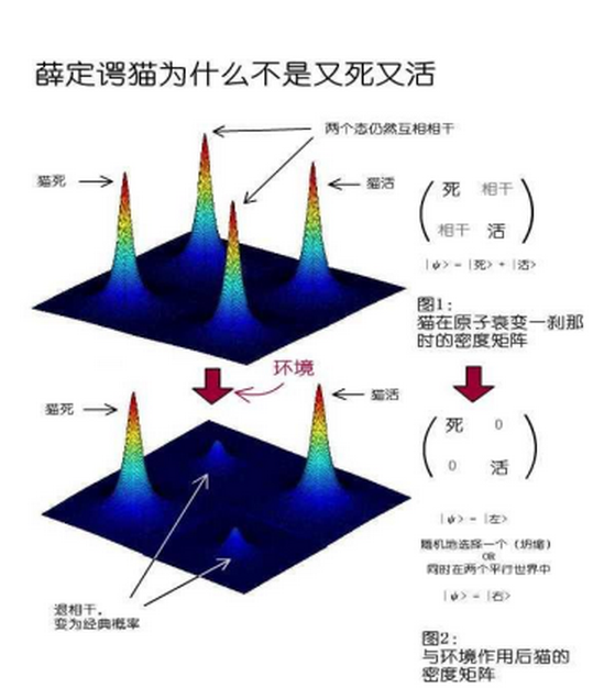 现在让我们考虑薛定谔猫的情况:当那个决定命运的原子衰变时,就这个原子本身来说,它的确经历着衰变/不衰变两种可能的精粒历史。原子本身只是单个粒子,我们忽略的东西并不多。但一旦猫被拖入这个剧情之中,我们的历史剧本换成了猫死/猫活两种,情况就不同了!无论是“猫死”还是“猫活”都是非常模糊的陈述,描述一只猫具体要用到1027个粒子,当我们说“猫活”的时候,我们忽略了这只猫与外界的一切作用,比如它如何呼吸,如何与外界进行物质和能量交换……等等。就算是“猫死”,它身上的n个粒子也仍然要和外界发生相互作用。换句话说,“猫活”和“猫死”其实是两大类历史的总和,就像“胜”是“1:0”,“2:0”,“2:1”……等历史的总和一样。当我们计算“猫死”和“猫活”之间的干涉时,我们其实穷尽了这两大类历史下的每一对精粒历史之间的干涉,而它们绝大多数都最终抵消掉了。“猫死”和“猫活”之间那千丝万缕的联系于是被切断,它们退相干,最终只有其中的一个真正发生!如果从密度矩阵的角度来看问题,则其表现为除了矩阵对角线上的那些经典概率之外,别的干涉项都迅速消减为0:矩阵“对角化”了!而这里面既没有自发的随机定域,也没有外部的“观测者”,更没有看不见的隐变量!