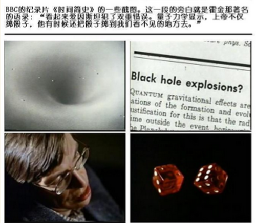 当物质落入黑洞的时候,它所包含的信息被完全吞噬了。因为按照定义,没什么能再从黑洞中逃出来,所以这些信息其实是永久地丧失了。这样一来,我们的决定论再一次遭到毁灭性的打击:现在,即使是预测概率的薛定谔波函数本身,我们都无法确定地预测!因为宇宙波函数需要掌握所有物质的信息,而这些信息却不断地被黑洞所吞没。霍金对此说了一句同样有名的话:“上帝不但掷骰子,他还把骰子掷到我们看不见的地方去!”这个看不见的地方就是黑洞奇点。不过由于蒸发过程的发现,黑洞是否在蒸发后又把这些信息重新“吐”出来呢?在这点上人们依旧争论不休,它关系到我们的宇宙和骰子之间那深刻的内在关系。不过最近霍金做了一次戏剧性的妥协:他愿赌服输,修改了自己多年以来的黑洞模型,承认黑洞可能在湮灭后释放出当初的信息!这也成了近来的一大热点新闻。