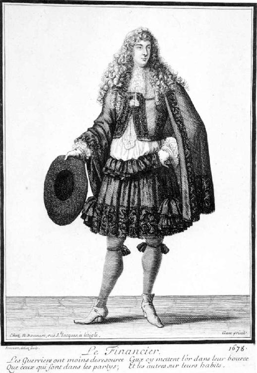 早期的喜剧经常戏仿一些脸谱化的金融家,尤其是一些吝啬鬼形象或者放高利贷者。然而,关于高级金融世界的现代叙述,却出现在17世纪80年代和90年代的巴黎舞台上。在一些标题通常强调巴黎背景的喜剧里,比如《巴黎的孩童》《巴黎人》,剧作家弗洛朗·卡尔东(又作当古)、让—弗朗索瓦·勒尼亚尔、夏尔·舍维莱·德尚梅莱,以及阿兰·勒内·勒萨热,无不思考着,金钱如何改写巴黎的游戏规则。17世纪80年代和90年代的喜剧中出现了一些现实主义的金融家形象,源于真实的、居住在黄金地段的巴黎金融家。勒尼亚尔称他们是“摩登老爷”——金融圈的老爷。