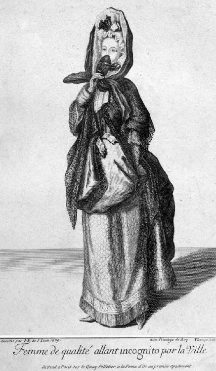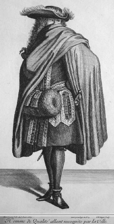 1689年,画家让·迪厄·德圣—让为后世记录了统治巴黎时髦的许多新发明。图3上的时髦男子炫耀着那个冬季最新的潮流,比如套在他右手上的河狸皮手筒。此外,他按当时最流行的方式披着当时颇为抢手的斗篷:将斗篷高高地提起,盖住下半个脸和鼻子。这并不是出于保暖的实际需求。17世纪80年代的巴黎,一个人穿着斗篷遮住脸出门,其实是为了表明,自己想要隐藏身份。男性通常不戴面具,但是在巴黎,如果男性拉上斗篷,他其实是正式表明自己“微服”出行,正如图中标题所示。第一次,高档时尚的配饰不再是让别人注意到自己的身份,而是表达不想被路人认出的愿望,其作用就像今天的太阳眼镜。当然,这也暗示,一个人这样保护自己,是因为他如此重要,所以身份需要保密。
