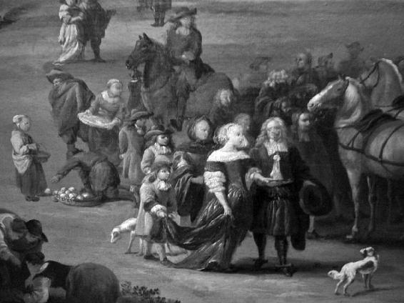 穿着时髦的人也让人们加深了“巴黎的公共步行道猎富者很多”的印象。这幅来自17世纪90年代的绘画(图7)中,就描绘了当时最著名的几位,包括卢瓦宗姐妹。这两人家世普通,长相美艳,因为疑似和法国社会的最高层人物有风流韵事,在当时成为流言蜚语的焦点。这两姐妹,一位金发,一位棕发,穿着当时最时尚的衣服,手挽着手走在巴黎的步行场所——基本可以确定,地点是杜乐丽花园。(这些最知名的“猎富者”和别人眼中打扮过度的金融家在这一点上很相似,她们的脸上也是浓妆艳抹。)
