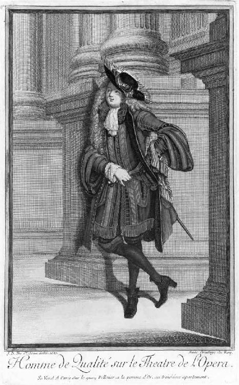 图6 这幅1687年出版的版画描绘了一位在巴黎歌剧院门口等候的贵族。这幅画宣传了这座城市两个重要的名声,一个是巴黎人公开展示的时尚服饰,另一个则是巴黎高质量的表演艺术