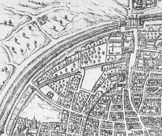 图2 这处来自布劳恩地图的细节也描绘了这块后来成为玛莱区的土地。1572年,这里还没有那么多街道,几乎没有显眼的建筑;大多数地段都未经开发