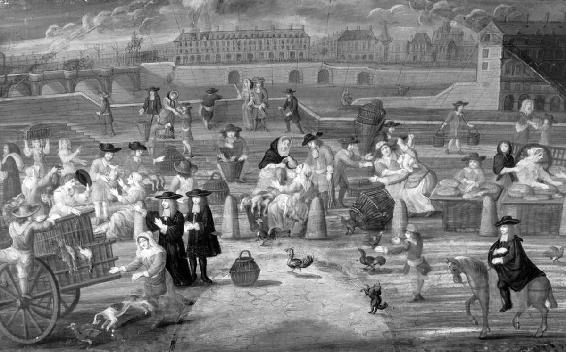 图5 这个位于塞纳河岸的露天集市于1679年8月开张。这幅图中,巴黎各个年龄、各个阶层的人相处融洽。似乎这幅图就是用来宣传这座美丽、精心规划的城市的生活质量