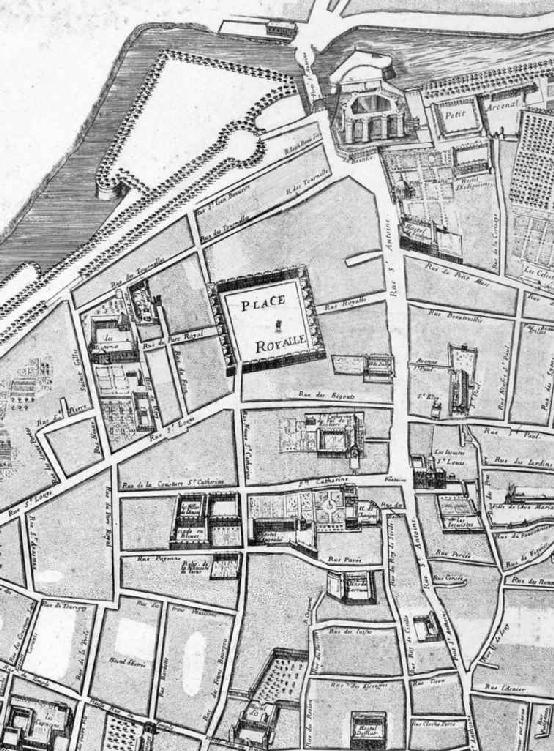 图4 从巴勒和布隆德尔这幅出版于1676年的地图上可以看到,玛莱区在一个世纪内发展成街道宽阔笔直、各类住宅汇聚的区域。新的公共步行道替代了布劳恩地图上的堡垒