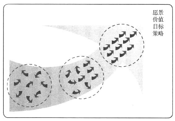 图4-2不仅有助于观者了解目前情况,也能成为安排优先级时的讨论架构。在这家化学品公司的案例中,我们把箭头一一填上不同的小组或项目名称。透过这个练习,就能看到当某个箭头转弯时,还有哪些人或项目会跟着转。我们先从小组开始练习,渐渐扩大讨论组的规模,用两天的时间全心全意将所有人调整成同一个方向,成功地让领导阶层及所有员工一起向共同的愿景、价值、目标与策略前进。