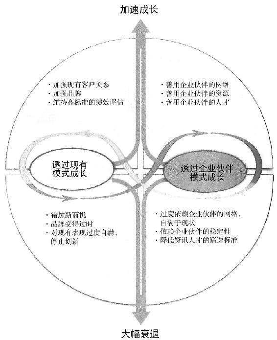 原本意见不同的两组人,突然发现原来技术团队的想法很不错,只是公司目前没有本钱执行这个选项。两个团队接着又更仔细地审视与其他企业同盟的这个选项,找出了另一个矛盾:透过现有模式成长及透过企业伙伴模式成长(如图5-12)。