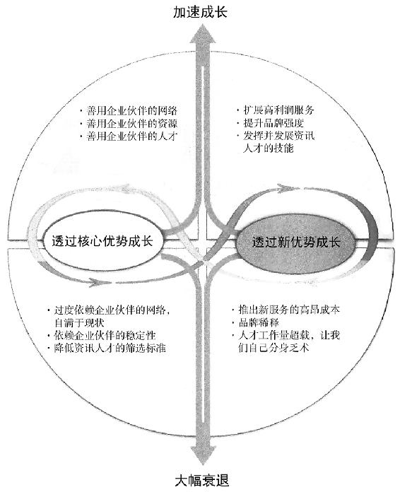 检视这些可能的结果后,这两个团队恍然大悟:没有“透过新优势成长”的代价非常大——比另一个策略同盟的选项失败的后果更糟。过度追求新优势以求成长的做法,则会造成资本大量流失,侵蚀品牌价值,以及无法提供足够的优质人才以满足客户需求。另一方面,过度偏向“透过核心优势成长”这个做法会导致业务衰退,但是公司只需几个月时间应该就能再爬起来,不会危及整个公司的存亡。