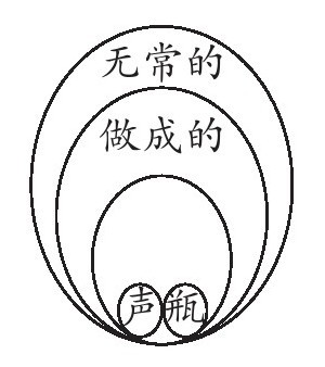 “声”与“瓶”同属于“做所的”一类,“做所的”又属于“无常的”一类,这叫做“以类予”。在万物之中,单举“瓶”和“声”相比,这是“以类取”。一切推论是归纳,是演绎,都把一个“类”字做根本。所以《大取》篇说: