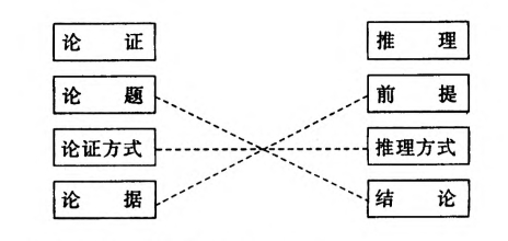 论证和推理是密切联系的,所有的论证都是推理,任何论证都必须借助推理。而所有的推理都是为论证服务的,论证是推理的目的。如果从结构要素方面去考察,论证中的论题、论据、论证方式与推理中的结论、前提、推理形式彼此是对应的。证明中的论据相当于推理中的前提,证明中的论题相当于推理中的结论,证明方式就是推理方式。这种关系可用图表示为: