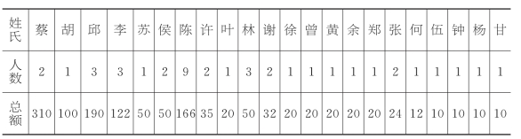 从表2可见,就捐款数额说,蔡氏最多,甲必丹蔡士章和船主蔡栋加起来310元,占总数的1/4。其次是邱氏3人,加起来190元,近总数的1/6。再次就是陈氏9人,人数最多,捐款166元,占总数1/10。第四是李氏3人122元,不到总数的1/10。第五是胡氏1人100元,总数的1/13。胡氏头衔为广东太学生。太学生即国子监学生之俗称。明清两代国子监学生多由省、府、州、县学生员中选拔,亦有由捐纳而得者,入监就学者有贡生、监生之分,然通谓之国子监生。在清代该头衔多为捐纳所得,但却因此取得所谓功名,名义上进入官员后备序列。因此碑文对捐资的胡德寿没有直呼其名,而是使用和“甲必丹大蔡公讳士章”类似的方式,称为“胡讳德寿”。其他捐款的只是在名字后面加上一个“官”字表示尊称罢了。