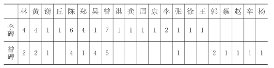 有意思的是,曾其禄的颂德碑树立于1707年初,与李为经的颂德碑时间仅相差20余年,但是立碑名单无一人相同。二碑姓氏统计如表1: