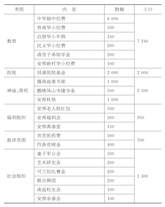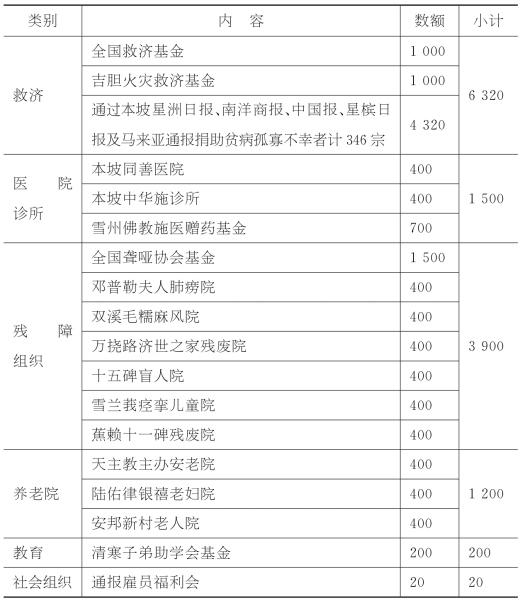 从表3可见,早期观音亭福利会的捐赠目标是救济,占当年度捐赠的一半。其次是残障组织,也有近1/3的比例。再次先后是医院诊所和养老院,教育捐赠只有区区200元。社会组织方面的捐赠更是少到仅有20元。