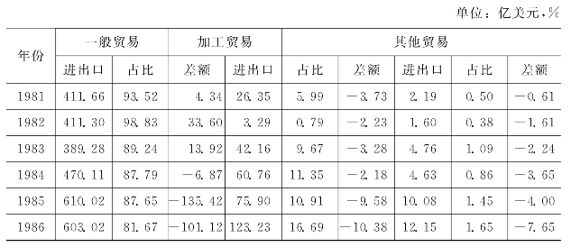 《开展对外加工装配和中小型补偿贸易办法》颁布之后,由于有了较为明确的政策指导,来料加工贸易逐渐进入发展轨道。受到当时的加工条件、技术水平和企业生产经营能力的限制,改革开放初期我国的加工贸易形式主要是“三来一补”,即来料加工、来样制作、来件装配和补偿贸易,其中又以来料加工为主。据统计,1980—1985年间,我国来料加工贸易总额由13.3亿美元增加至49.1亿美元,增长了2倍多。