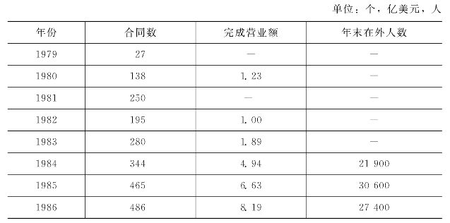 十一届三中全会后,中央明确指出,积极发展对外经济技术合作,吸收利用国外资金和先进技术,发展生产力,并提出要利用国际国内两种资源、两个市场,学会两种本领组织国内建设和发展对外经济关系。在对外经济合作中,通过多种途径从发达国家引进资金和技术,与发展中国家开展合资经营,对外承包工程与劳务合作,举办海外合营企业或独资企业,与联合国及其他国际组织开展多边合作,同时也接受国际经济技术援助。1979年以来,我国对外承包工程合同数量不断增加。1979年我国对外承包工程合同数量仅为27个,截至1986年年底对外承包工程合同数则达到486个。我国对外承包工程完成营业额增长迅速,1980年对外承包工程完成营业额1.23亿美元,1986年则达到8.19亿美元。在对外经济合作中,我国也充分发挥劳动力资源丰富的优势,积极开展多种形式的合作,1986年我国对外承包工程年末在外人数和劳务合作人数共计46 400人。(见表4-8)