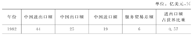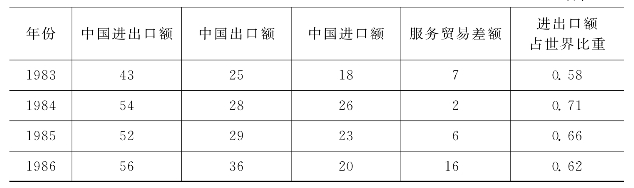 改革开放后,我国工业化、现代化迅速发展,经济结构发生了很大变化,服务业在国民经济中的地位也日益突显。但在改革开放之初,我国服务业占国民经济比重仍然偏低,服务业发展水平较低。按照《服务贸易总协定》,我国参与国际服务贸易可以认为始于1979年开展的对外工程承包和劳务合作。1980—1986年期间,我国服务业占国民经济比重低于30%,批发、零售业成为服务业的最大行业,占比30%左右。这一时期,我国服务贸易缓慢发展,进出口总额缓慢增长,由1982年的44亿美元增长到1986年的56亿美元,占世界服务贸易比重也有所提升。(见表4-5)