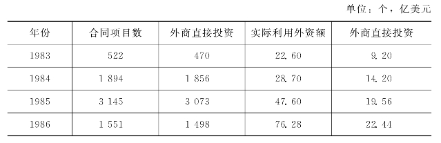改革开放后,我国社会主义现代化建设面临着资金和外汇紧缺的难题,利用外资成为解决问题的重要途径。积极采取措施吸收外国资金成为我国对外经济贸易工作的一个重点。1979—1986年,是我国利用外资的起步阶段。在宏观控制贷款规模的前提下,我国积极利用多种形式的外资,重视引进国外先进技术,加快重点项目建设,提高外资利用效率,将利用外资作为保持中国经济发展后劲的一项重要举措。1983—1986年间我国利用外资金额增长了近2.4倍,其中外商直接投资金额由9.2亿美元,增长至22.44亿美元,累计利用外资175.18亿美元。(见表4-7)