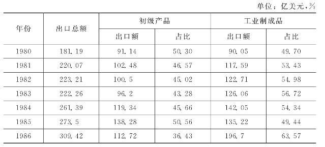改革开放初期的1978年,我国出口产品中初级产品占比超过50%,1980年我国出口产品中初级产品与工业制成品比例便大体上达到一半对一半,出口额均超过90亿美元。随着我国鼓励加工贸易政策的出台,工业制成品出口发展迅速,1986年我国工业制成品出口已接近200亿美元,占我国商品出口的60%以上。实际上,自1981年以后(除1985年外),我国出口产品中工业制成品比重均高于50%。(见表4-3)