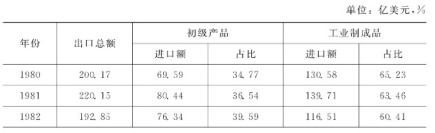 改革开放初期,我国外汇极度紧缺,为应对国内初级产品供应不足的情况,初级产品进口占据我国进口商品的1/3以上,并在1980—1982年间,初级产品进口占比逐年上升,曾经一度接近40%。但随着我国国民经济的恢复和加工贸易的迅速发展,一方面我国初级产品供给能力不断提升,另一方面我国通过加工贸易的发展创汇能力进一步提高。这就使得我国具备一定条件引进先进技术设备等工业制成品,改造和提升我国产业发展水平。自1984年以来,我国工业制成品进口便迅速提升到80%以上。(见表4-4)