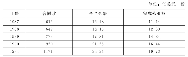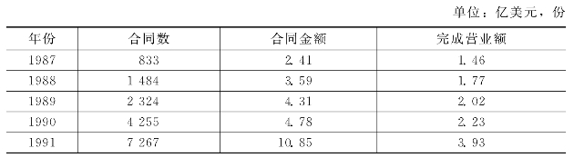 1987—1991年,我国积极开拓国际承包劳务市场,加强管理和协调,对外承包工程、劳务合作迅速发展。