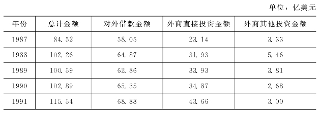 1987—1991年,我国利用外资工作取得了较大进展,引资金额由1987年的84.52亿美元增加到1991年的115.54亿美元(见表5-17),并在引资工作中不断积累了利用外资经验,这在1987—1991年的政府工作报告中都有所体现。