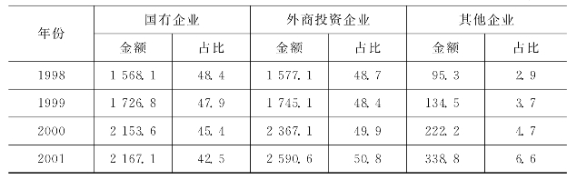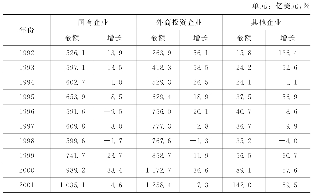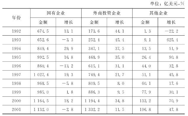 1992年,国有企业、外商投资企业以及集体和私营企业等其他企业货物贸易进出口总额分别为1 200.6亿美元、437.5亿美元和17.1亿美元,分别占当年我国外贸总额的72.5%、26.4%和1.0%。随后,尽管国有企业和外商投资企业外贸规模都呈现了增长态势,但由于外商投资企业外贸增速远高于国有企业,在1998年外商投资企业的外贸规模首次超过国有企业,成为我国对外贸易第一大主体。2001年,国有企业占我国对外贸易份额下降为42.5%,比1992年下降了30个百分点;外商投资企业份额上升为50.8%,在1992年的基础上增加了23.6个百分点。1992—2001年其他企业在我国对外贸易中的份额总体不断上升,2002年达6.6个百分点。(见表6-4)