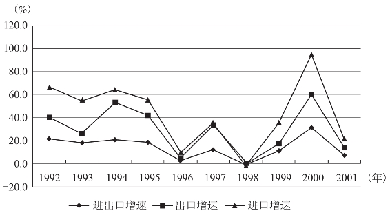 20世纪90年代我国对外贸易增幅波动较大,但总体上保持了快速增长,1992—2001年,货物进出口平均增速为13.3%。尤其是2000年的增幅高达31.5%。从出口看,1992—2001年平均增幅为13.5%,并且所有年份都保持了正增长,增幅最大的年份是1994年,为31.9%;进口年均增幅为13.1%。(见图6-1)
