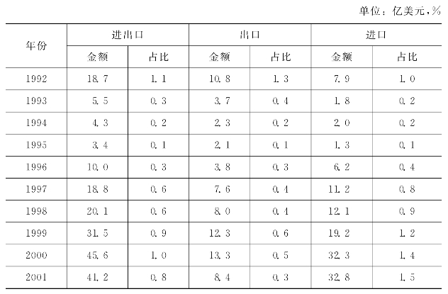 边境贸易尽管在我国货物贸易中的比重较低,但对我国加强与周边国家的经贸合作发挥了重要作用。边境贸易的发展与国家的边贸政策密切相关,1992年邓小平的南方谈话以及14个沿边城市的开放带动了边境贸易的快速发展,当年边境贸易进出口总额达到18.7亿美元,占货物贸易总额的比重也达到1.1%。1993年后随着边境贸易政策的收紧,边境贸易额出现较大幅度的下降,当年仅为5.5亿美元,占比相应降为0.3%,到1995年,边境贸易总额进一步为3.4亿美元,占比为0.1%。1996年随着国家鼓励政策的出台,边境贸易呈现了较快的发展,1996年上升为10亿美元,2001年达到41.2亿美元。与此同时,边境贸易出口额也呈现了波动,1992年已经达到10.8亿美元,占我国外贸出口总额的1.3%,1993年下降为3.7亿美元,占比降为0.4%,随后边境贸易出口呈现上升趋势,2000年达到13.3亿美元,2001年又有所下降为8.4亿美元。进口额1992年为7.9亿美元,此后三年处于下降,1995年仅为1.3亿美元,以后不断上升,2001年达到32.8亿美元,占比达到1.5%。(见表6-15)
