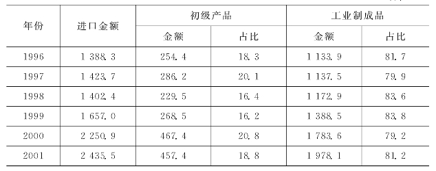工业制成品是我国进口的最主要的商品。20世纪90年代,尽管我国初级产品进口和工业制成品进口在商品进口总额中的份额有一些波动,但总体看,保持了相对稳定,初级产品和工业制成品的进口基本维持了20%和80%的比例。具体看,1992—2001年,初级产品进口总额从132.6亿美元增加为457.4亿美元,年均增幅为14.8%;工业制成品进口总额从673.3亿美元增长为1 978.1亿美元,年均增幅为12.7%。(见表6-10)