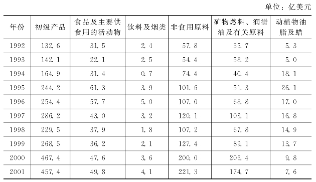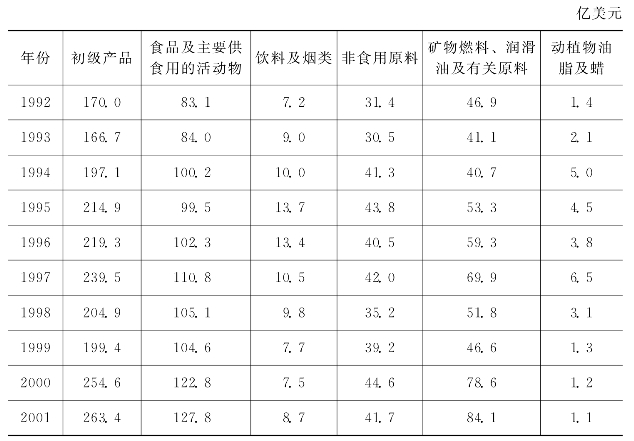 从初级产品看,食品、饮料烟类、非食用原料、矿物燃料、动植物油脂等主要的出口类别,其中食品和矿物燃料在我国初级产品出口中占据重要地位。1992—2001年,食品及主要供食用的活动物出口额从83.1亿美元增加为127.8亿美元,年均增幅为4.9%,占我国初级产品出口总额比重基本维持在50%左右,平均为49%。矿物燃料、润滑油及有关原料出口额从1992年的46.9亿美元增加为2001年的84.1亿美元,年均增幅为6.7%;占初级产品出口总额的比重也有所上升,从1992年27.6%提高到2001年31.9%。2001年食品和矿物燃料出口占我国初级产品出口总额的比重达到80.4%。(见表6-8)