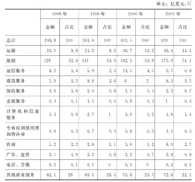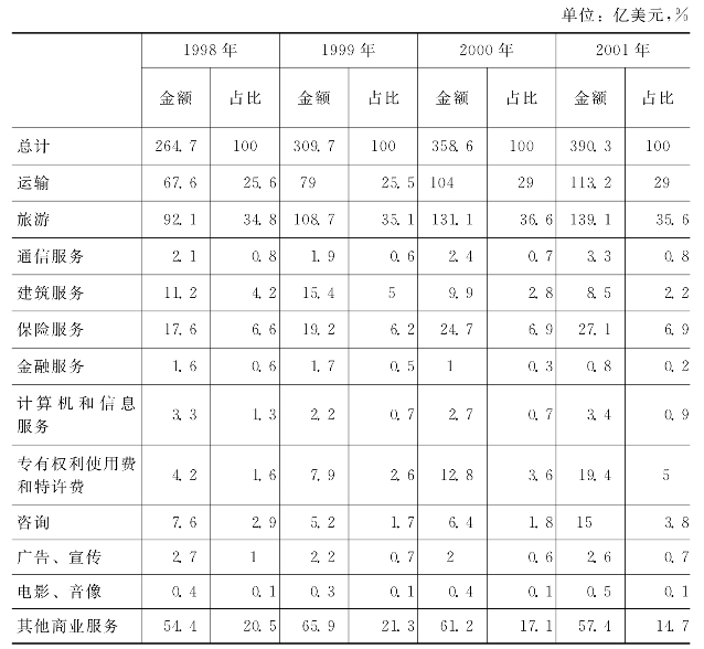 20世纪90年代,我国服务贸易呈现了快速发展态势,旅游和运输等传统行业在我国服务贸易中占据主导地位。