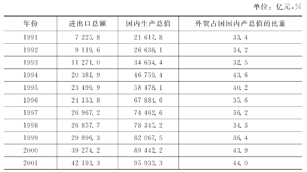 对外贸易日益成为国民经济的重要组成部分。1991—2001年,受金融危机的影响,我国货物进出口总额占国内生产总值的份额出现了波动,但总体呈现了上升趋势,从33.4%增为44.0%,十年间外贸依存度上升超过了10个百分点。(见表6-3)