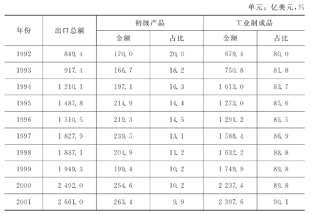 工业制成品是我国出口的主要商品。1992—2001年,我国工业制成品出口额从679.4亿美元增加为2 397.6亿美元,年均增幅为15.0%;占我国商品出口份额逐年上升,从80%增长为90.1%,说明我国出口商品结构有了较大优化。初级产品出口尽管规模也不断扩大,从1992年的170亿美元增加为2001年的263.4亿美元,年均增幅为5%。由于初级产品出口平均增速远低于工业制成品,初级产品出口在我国商品出口中的份额不断下降,1992—2001年,从20%降为9.9%,下降了10.1个百分点。(见表6-7)