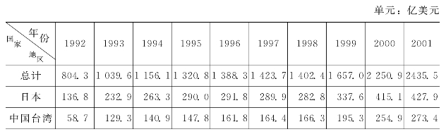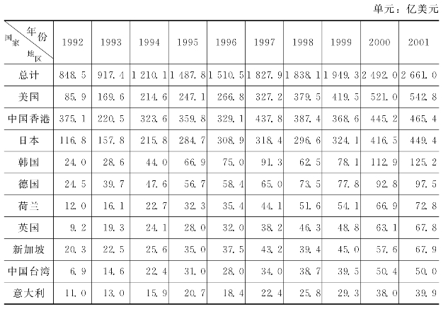 除了1992年外,日本、台湾省和美国是我国前三大进口来源地。1993—2001年,日本一直保持我国第一大来源国,来自日本的进口份额保持在20%左右。我国来自日本的进口额从1992年的136.8亿美元增加为427.9亿美元(见表6-17),年均增幅13.5%,高于前十大进口来源地的平均增速。台湾省也是我国最主要的进口来源地,1992—2001年,除了1992年、1995年和1998年三年是位列第三外,一直是我国第二大进口来源地,我国来自台湾省的进口平均份额为11.3%。美国也是我国重要的进口来源国,基本保持了第三大进口来源国的地位,1995年和1998年甚至超越了台湾省成为我国的第二大进口来源地。1992—2001年来自美国的进口额占货物进口总额的平均比重超过了11%,基本与台湾省持平,近几年稍微有所下降,2001年占比为10.8%。