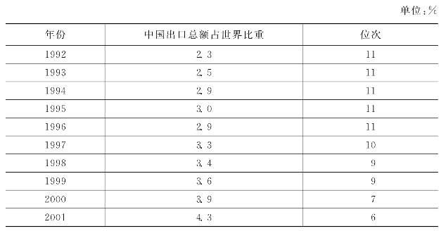 随着我国对外贸易规模的不断增长,我国出口在世界货物贸易出口的比重也不断上升,1992年,我国货物出口占世界的比重仅为2.3%,1995年已为3%,2001年达到4.3%,比1992年上升了2个百分点。我国货物出口在世界中的位次也不断提升,1992—1996年一直保持在第11位,从1997年位次不断攀升,2001年为世界第6位。(见表6-2)