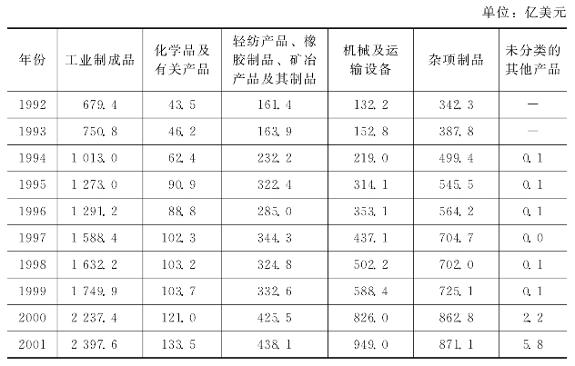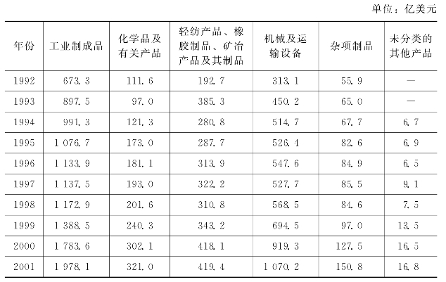 工业制成品中,机械及运输设备是最重要的出口产品。1992—2001年,机械及运输设备出口额从132.2亿美元增长为949.0亿美元,年均增幅高达24.5%,是出口增长最快的商品;占工业制成品出口份额大幅上升,从1992年的19.5%增加到39.6%,2001年取代杂项制品成为工业制成品第一大类出口产品。杂项制品一直是我国工业制成品出口的最主要的大类,1992—1999年,其出口占工业制成品的份额一直保持领先,1992年和1993年超过了50%,到2001年尽管份额出现较大下降,但占工业制成品出口总额的比重也达到36.3%。1992—2001年,我国轻纺产品出口保持了一定的增速,但在工业制成品中的比重有小幅下降,从23.8%降为18.3%,降低了5.5个百分点。(见表6-9)