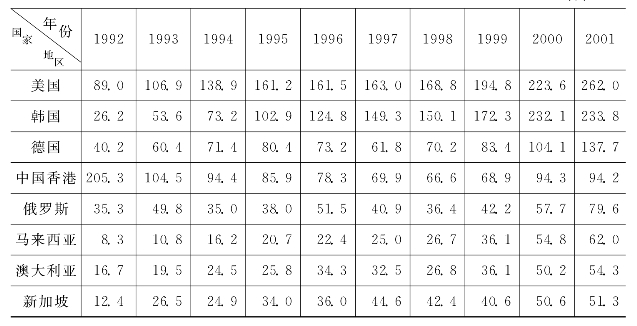 美国、中国香港和日本是我国前三大商品出口目的地。其中,我国对美国市场商品出口增幅最快,从1992年的85.9亿美元增加为2001年的542.8亿美元,年均增幅为22.7%,远高于对外贸易出口平均增速(13.5%)。美国从1997年开始完全超越日本成为我国第二大出口国,1999年进一步超越香港成为我国第一大出口市场;对美国的出口额占我国出口贸易的比重从1992年的10.1%上升为2001年的20.4%。香港一直是我国最重要的出口市场,1999年之前一直是我国第一大出口目的地,1992年我国对香港的出口份额达44.2%,随着我国加大了与欧美国家贸易往来,对香港的出口份额有所下降。尽管如此,到2001年,我国仍有17.5%的商品是销往香港的。香港依旧是我国的第二大出口市场。我国对日本的出口保持了快速增长,1992—2001年,从116.8亿美元增为449.4亿美元,年均增幅为16.2%;对日本出口的市场份额从13.8%上升为16.9%。日本是我国第三大出口目的地。