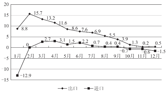 亚洲金融危机冲击了我国外贸增速。从1997年下半年起,我国外贸出口增势明显受阻,增长速度从上半年的26.3%降为17.1%。1998年外贸状况不断恶化,出口增幅逐月回落,从2月份到11月份出口额连续出现下降,累计出口增速回落到15年来的最低水平。全年外贸进出口总额3 239.5亿美元,比上年下降0.4%,是1983年以来首次出现负增长。其中进口为1 402.4亿美元,下降1.5%,出口为1837.亿美元,增加0.5%,尽管没有下降,但增幅远低于1997年的21.0%增速。(见图6-2)