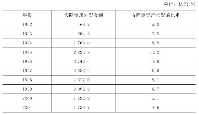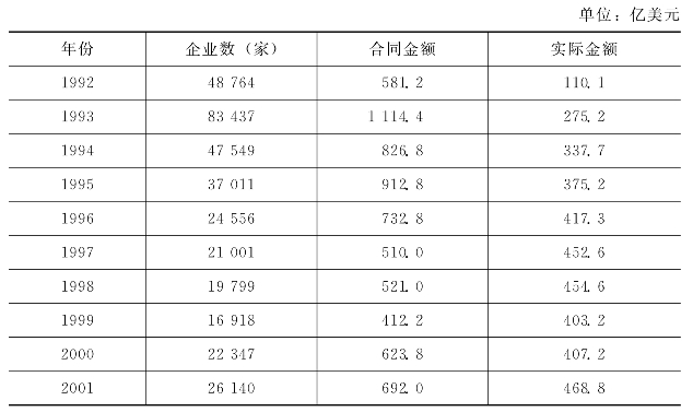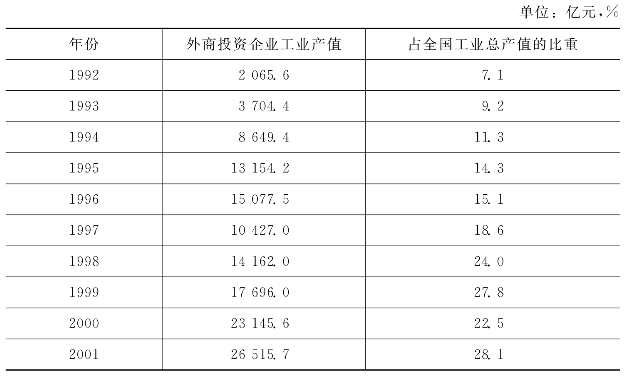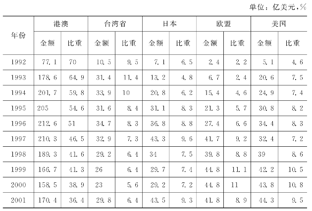 20世纪90年代,随着我国全面融入世界经济中,外商投资政策法规不断完善,投资环境得到较大改善,外商投资来源结构不断优化。90年代初期,来自港澳台的中小型项目占据我国外商直接投资的绝大部分,到了2001年来自美国、欧盟和日本的跨国公司对我国的投资已经占据了重要位置。1992—2001年来自台港澳的投资占我国外商直接总额的比重从79.5%下降为42.8%;相应地,来自欧美日对华投资占我国外商直接投资的比重从13.3%上升为27.7%。