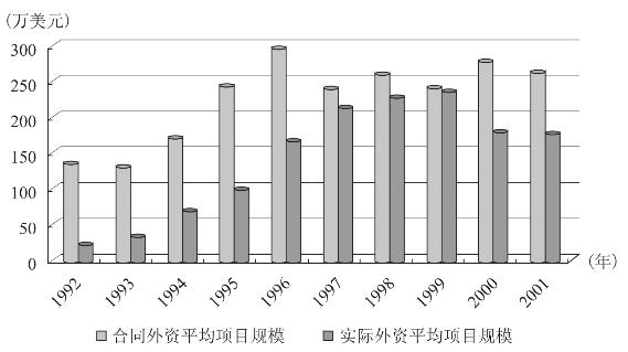 我国实际利用外商直接投资平均单项规模大幅增长。1992—2001年,尽管我国实际利用外商直接投资平均单项有过波动,但总体上呈现了大幅上涨的趋势。1992年我国实际外商直接外资平均单项规模仅为22.6万美元,此后逐年上升,1999年达到238.2万美元,随后两年有所回落,但2001年仍然为179.3万美元,是1992年的近8倍。这表明20世纪90年代我国利用外资质量大幅度提升。(见图6-5)