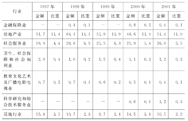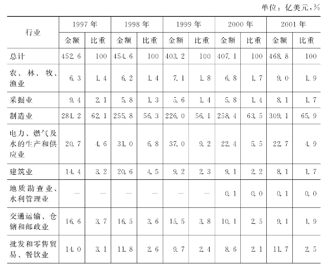 从具体行业看,制造业是20世纪90年代外商直接投资的第一大行业。1997—2001年,制造业利用外资从218.2亿美元增加为309.1亿美元,年均增幅2.4%,占我国实际利用外商直接投资总额的60.8%,2001年比重为65.9%,占我国第二产业实际利用外商直接投资总额的份额平均高达85.3%。房地产业是我国实际利用外商直接投资的第二大行业,1997—2001年,每年超过50亿美元的外资进入了房地产业,平均占我国实际利用外商直接总额的12.4%。房地产业也是我国利用外资最多的服务行业,1997—2001年,第三产业吸收的外商投资总额的平均有45.7%是进入了房地产业。电力、燃气及水的生产和供应业也是外商投资较多的行业,1997—2001年平均每年有26.8亿美元的进入,占同期我国外商投资总额的6.2%。此外,以旅店业为主的社会服务业也吸引了较多的外商投资,1997—2001年外商直接投资总额的5.6%是投资于社会服务业。(见表6-25)