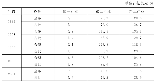 受我国外商实际直接投资产业和行业统计数据的限制,本部分的统计数据从1997年开始。从下表6-24可以看出,第二产业是我国外商直接投资进入的主要产业,1997—2001年外商平均有71.3%的金额是投资于第二产业;平均有27.1%的金额是投资于第三产业;投资第一产业的金额非常少,平均仅占外商直接投资总额的1.6%。
