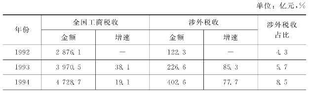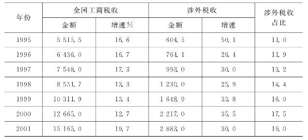外商直接投资带来高速增长的涉外税收,成为我国税收的重要组成部分。1992—2001年我国涉外税收从122.3亿元增长为2883.0亿元,年均增幅高达42.7%,远高于同期全国工商税收平均的20.3%的增幅;涉外税收占全国工商税收总额的比重相应从4.3%上升为19.0%,十年增加了14.7个百分点。(见表6-28)