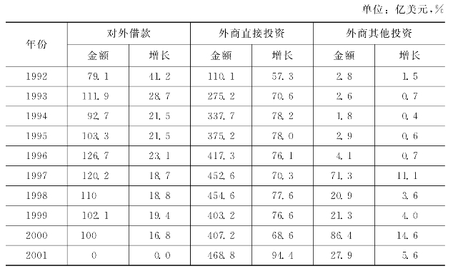 外商直接投资取代对外借款成为我国最主要的利用外资方式。我国利用外资的方式有对外借款、外商直接投资和外商其他投资。从1992年开始,外商直接投资开始取代对外借款成为我国最主要的利用外资投资。并且份额逐渐上升,1992年外商直接投资占我国实际利用外资总额的57.3%,2001年已经上升为94.4%,增加了37.1个百分点,1992—2001年,外商直接投资占我国实际利用外资的平均比重为74.8%。与此同时,对外借款占我国实际利用外资的比重逐年下降,1992年比值为41.2%,1993年已下降了12.5个百分点,降为28.7%,2001年已经降为0。(见表6-23)