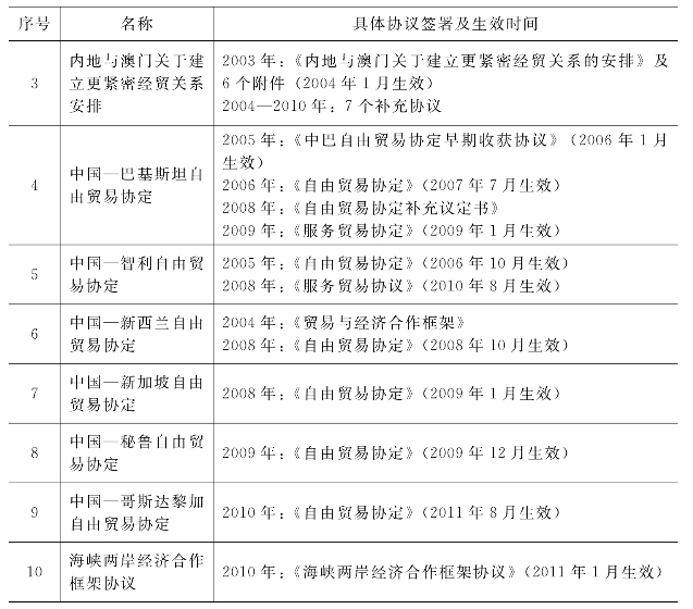 截至2010年年底,中国正在分不同阶段予以推进的自由贸易区遍及亚洲、大洋洲、拉美、欧洲、非洲的36个国家和地区。其中,中国与中国香港、中国澳门、东盟、智利、巴基斯坦、新西兰、新加坡、秘鲁、哥斯达黎加、中国台湾已经签订自由贸易协定,并且已经开始自由贸易区建设。中国与海合会、南部非洲关税同盟、冰岛、挪威、澳大利亚正在进行自由贸易区谈判。此外,中国—印度自由贸易区、中国—韩国自由贸易区、中日韩自由贸易区正在进行官产学联合研究,中国—瑞士自由贸易区联合研究已经结束。